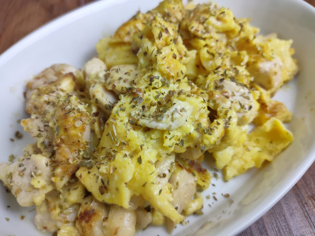 - Goreng telur sampai ½ padat lalu Masukkan ayam dan keju